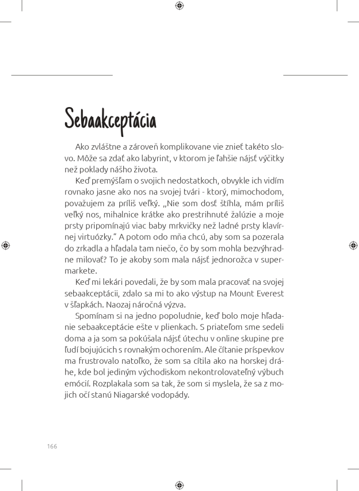 Táto kniha nie je o tom, ako sa s chorobou len „naučiť žiť“. Je o tom, ako ju prijať nie ako trest, ale ako novú kapitolu, ktorú môžeš napísať po svojom. Ako v sebe objaviť silu, aj keď máš pocit, že už žiadna nezostala. Ako sa nevzdať svojich snov – aj keď možno budú vyzerať trochu inak, než si si ich pôvodne vysnívala.